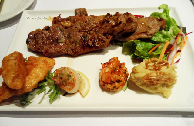 Beef & Reef : "grilled tender ridge beef sirloin, lightly fried barramundi fillets, grilled chilli tiger prawn and scallop with spiced creamy sesame sauce"